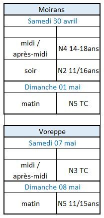 Les N4 14-18 : Samedi 30 avril : RDV à 14h15 à Moirans en salle d’échauffement, début de la compétition à 16h15 en barres, Palmarès à 17h55.