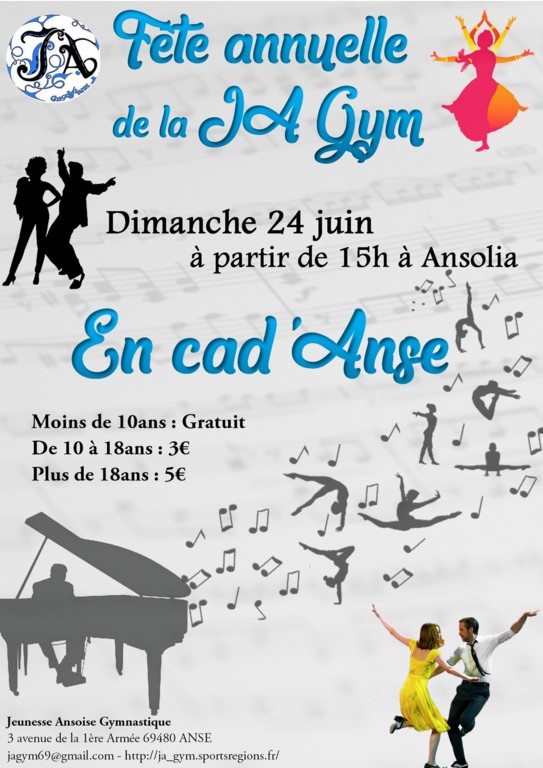 Dimanche 24 juin nous accueillerons l'ensemble de nos gymnastes, leur famille, amis et fan club pour la grande fête annuelle de la JA GYM qui débutera à 15h à Ansolia.