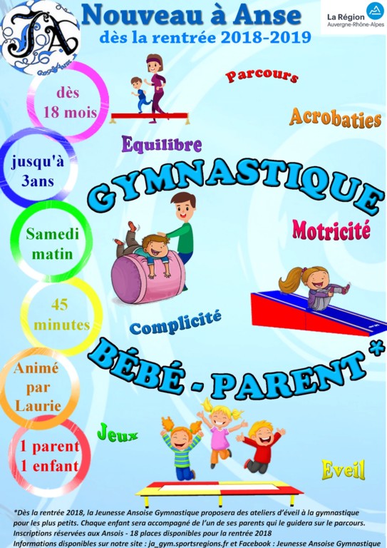 La JA Gym proposera le samedi matin des cours de 45 minutes de gymnastique Bébé-parent pour les enfants âgés de 18 mois à 3 ans.