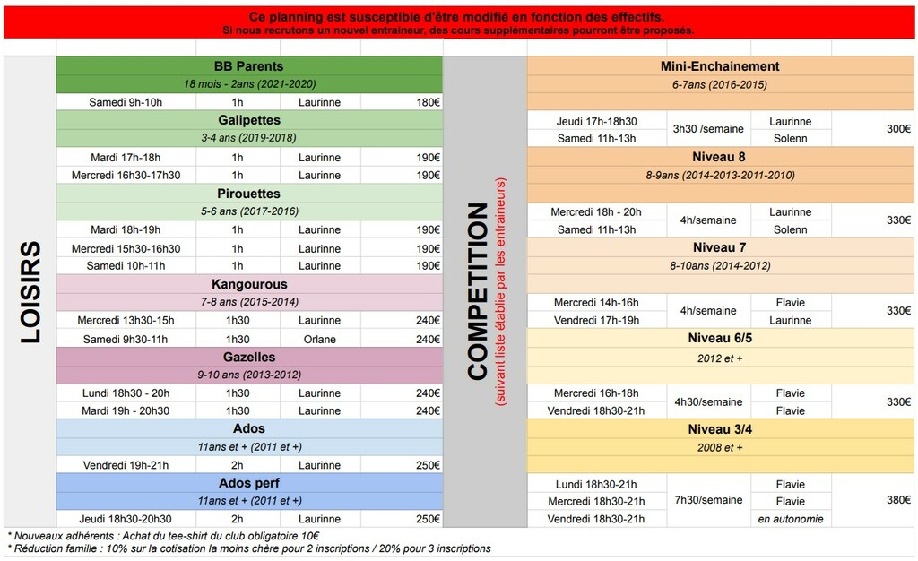 Voici le planning des entrainements pour la saison 2022-2023 (l'affectation des enfants en groupe compétition est décidée par les entraineurs, les parents en ont été informés).