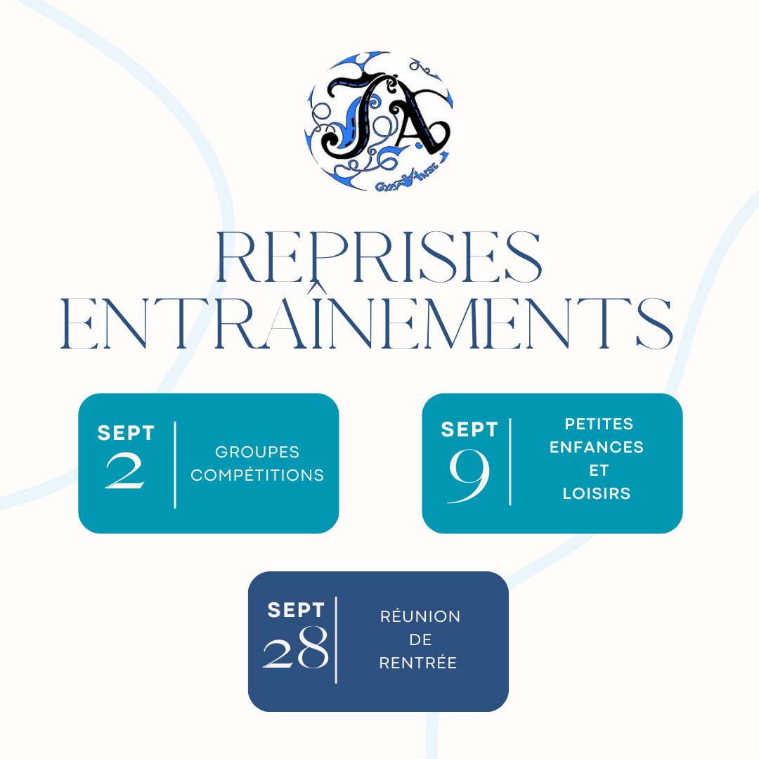 🤸♀️ Reprise des entraînements la semaine du 02 septembre pour les groupes compétitions, la semaine du 09 septembre pour les groupes petites enfances et loisirs.